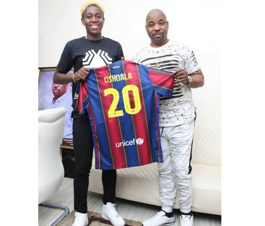 Super Falcons captain, Asisat Oshoala visits MC Oluomo