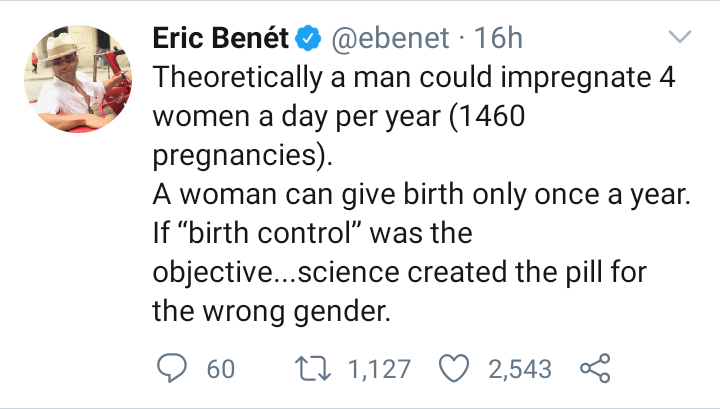 He argued that since men can impregnate 4 women in a day( that’s 1460 pregnancies per year) and a woman can only give birth once in a year then science created the birth control pill for the wrong gender.