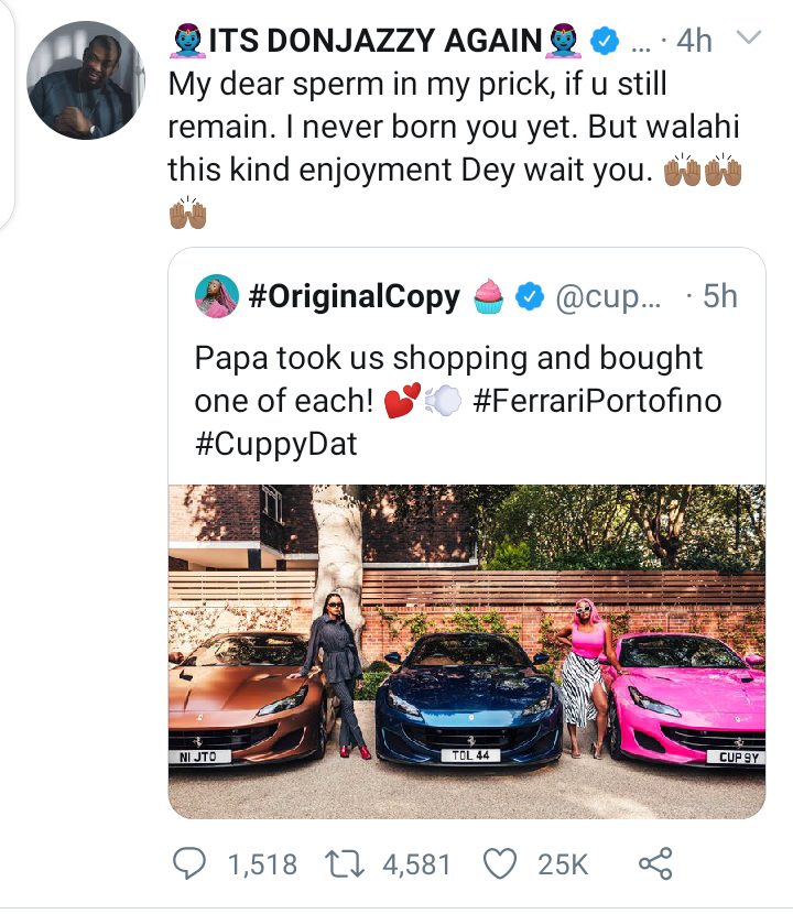 Don Jazzy quote-tweeted Cuppy’s post announcing the arrival of the luxury Ferrari gift and he wrote: “My dear sperm in my prick, if u still remain. I never born you yet. But walahi this kind enjoyment Dey wait you.”