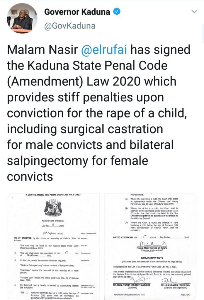 The Governor of Kaduna State, Nasir El-Rufai, has signed the Kaduna State Penal Code (Amendment) Law 2020.