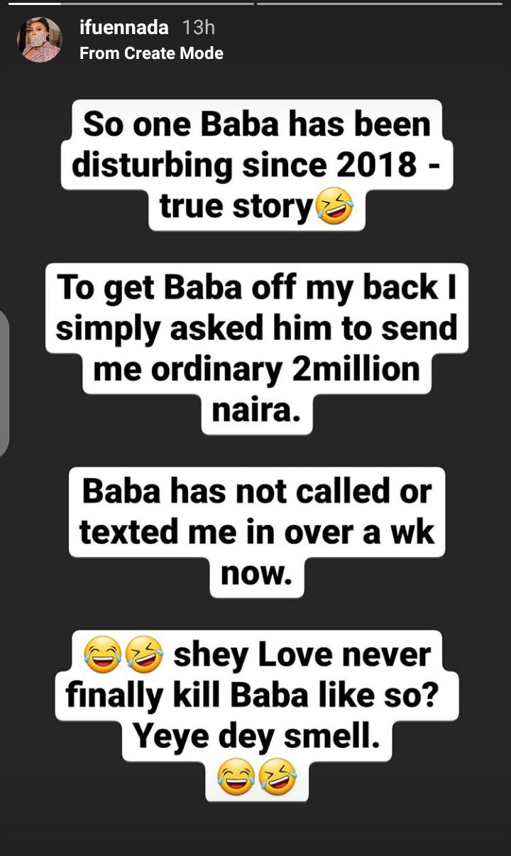 To get him off her back, she simply asked him to send her “ordinary 2 million Naira”.
