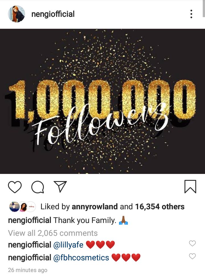 The Bayelsa born whose real name is Rebecca Nengi Hampson, today, Sunday, September 27, got over 1 million followers on her Instagram page.