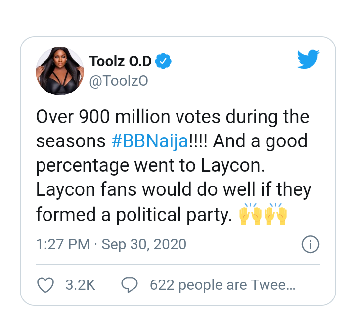 Taking to twitter to make this revelation, Toolz wrote; “Over 900 million votes during the seasons #BBNaija!!!! And a good percentage went to Laycon. Laycon fans would do well if they formed a political party.”
