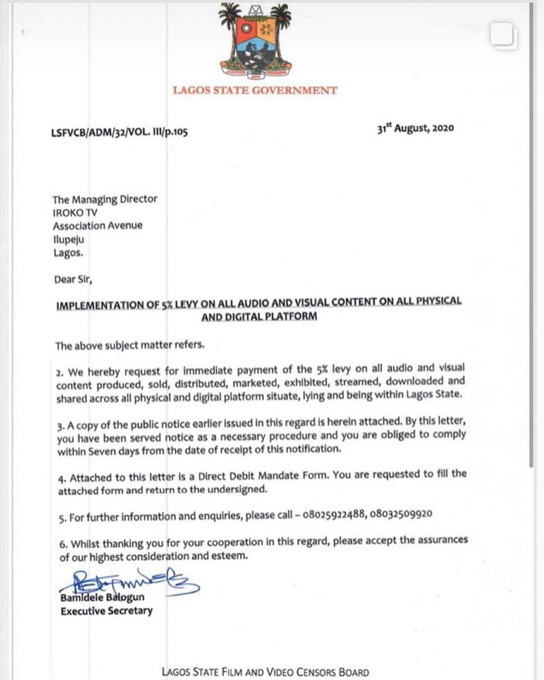 In the notice addressed to the manager of Iroko TV, the Lagos State Government requested for the “immediate payment of 5% levy on all audio and visual content produced, sold, distributed, marketed, exhibited, streamed, downloaded and shared across all physical and digital platform situate, lying and being within the state.”
