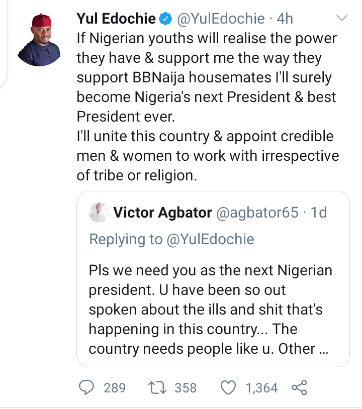 Nollywood actor Yul Edochie believes he will surely emerge Nigeria’s next and best president if the youths can support him like they did Big Brother Naija housemates.