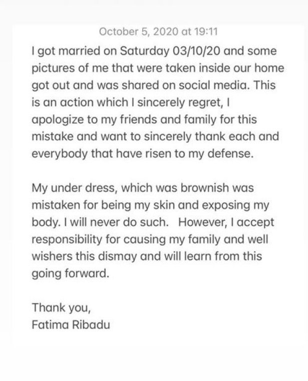 Newly married daughter of pioneer EFCC chairman, Nuhu Ribadu, Fatima Ribadu, has apologised for wearing a wedding dress which many described as anti-Islamic as it was said to have exposed too much flesh.