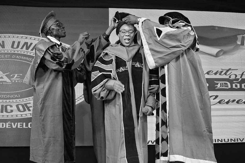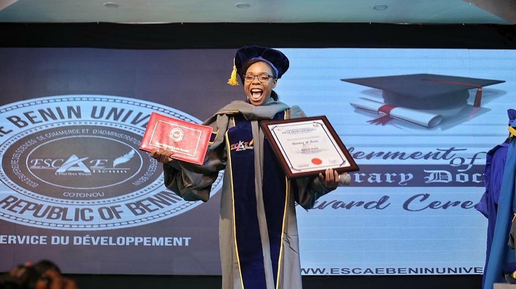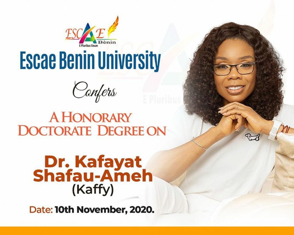 Kafayat Shafau-Ameh, Nigerian dancer, choreographer, and dance instructor has been conferred with an Honorary Doctorate from Escae Benin University in Benin Republic.