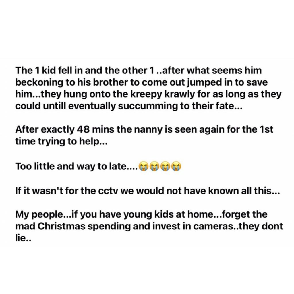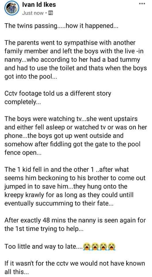 The parents went to sympathise with another family member and left the boys with the live -in nanny…who according to her had a bad tummy and had to use the toilet and thats when the boys got into the pool…