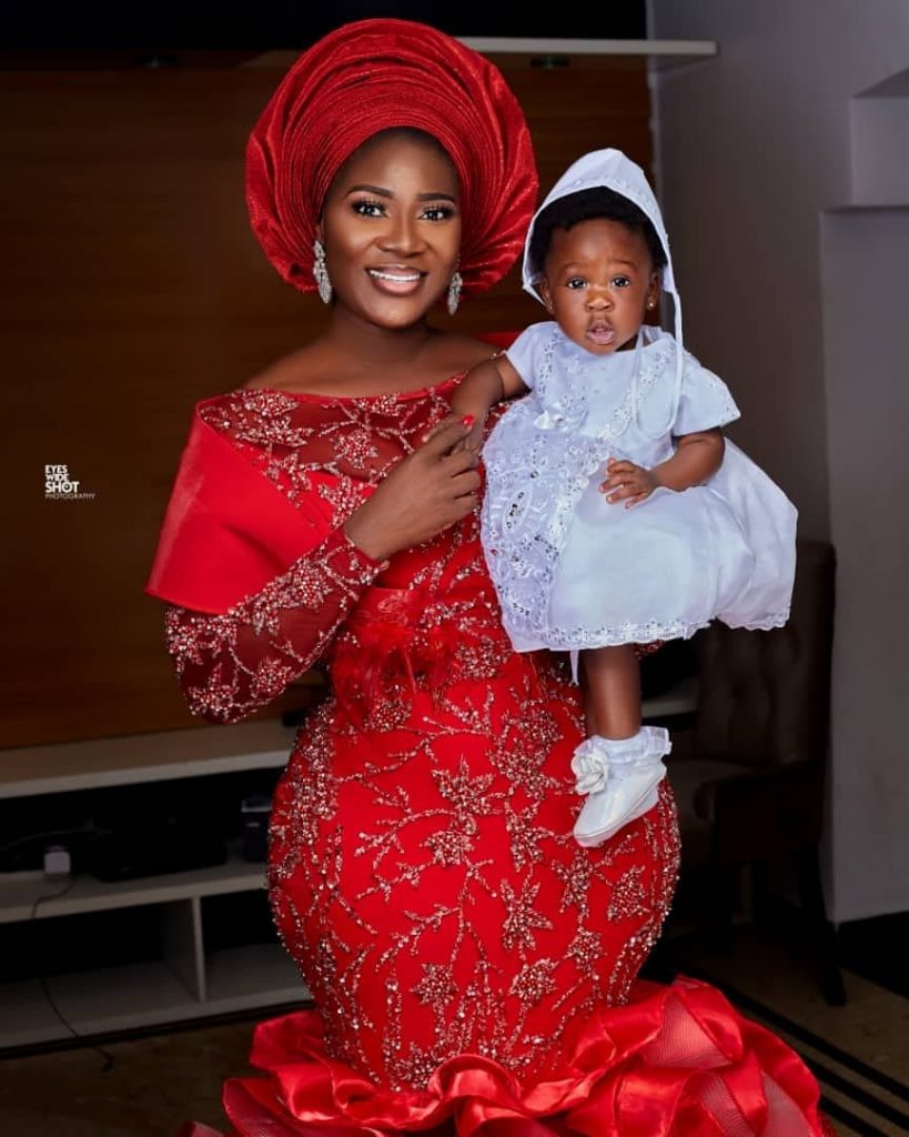 Photos of Nollywood actress, Mercy Johnson’s breathtaking outfit for her 4th baby dedication that took place over the weekend has surfaced on social media.