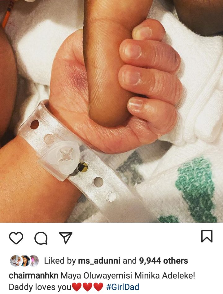 Adding to the above information, the excited new dad also revealed the name of their pretty daughter, “Maya Oluwayemisi Minika Adeleke! Daddy loves you. GirlDad,” he captioned the photo below he shared.