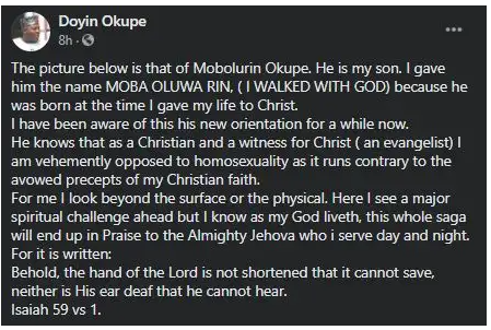 In a swift response, the father, Doyin Okupe reacted to his son’s revelation.