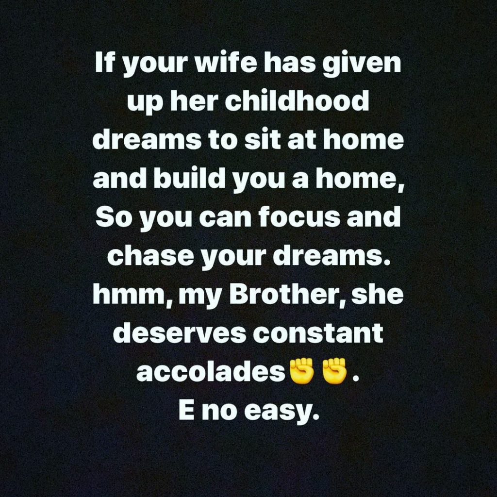 “Respect your housewife. E no easy to give up everything.