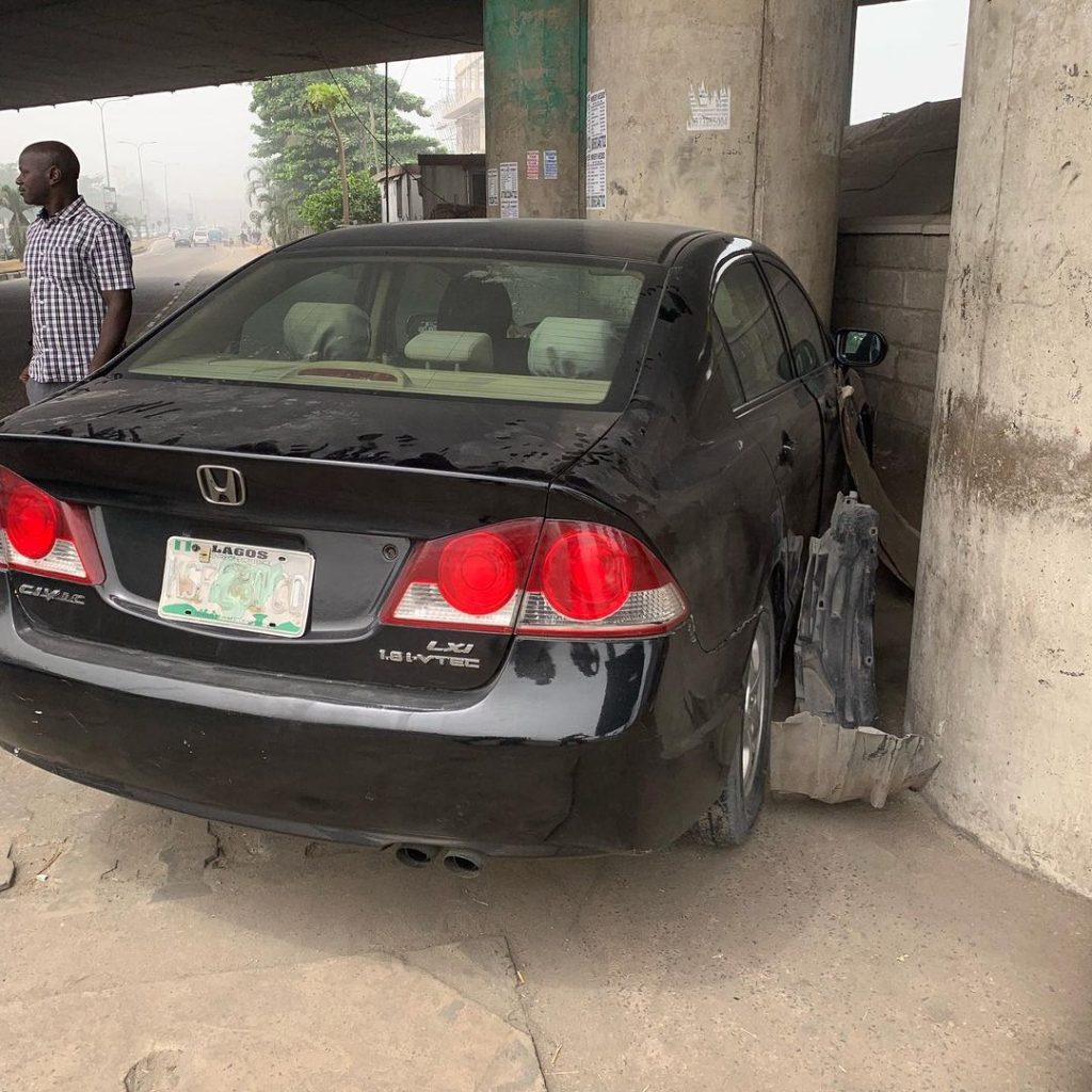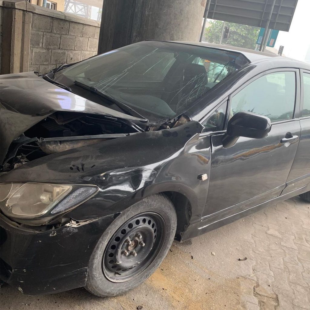 She shared some photos from the accident scene and wrote, ” This time last year, the devil tried it. I woke up on the morning of that day feeling very uneasy. As I was about to step out of the house, something told me to pray… then I started praying aggressively for one hour after which I got into my car and left. So on my way to the market, my brake failed completely and there was traffic on the road, and right in front of me was a school bus filled with children. I started screaming and suddenly , my car diverted and then hit the bridge pole like 3 times . For a second, I thought I will come out with either a broken head, smashed face, unconscious or even dead but Mercy said no, and brought me out of the car unhurt. “