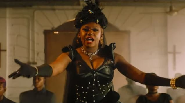 At the beginning of the visuals, she walks into an ongoing church service where the congregations are seen bearing horns on their foreheads.