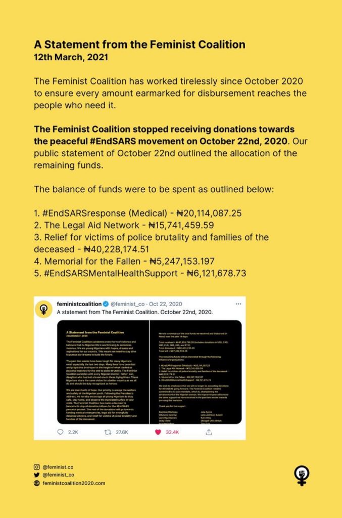 Some Twitter users have accused the Feminist Coalition (FemCo) of moving N23 million in bitcoin donated for the #EndSARS protest to another site.