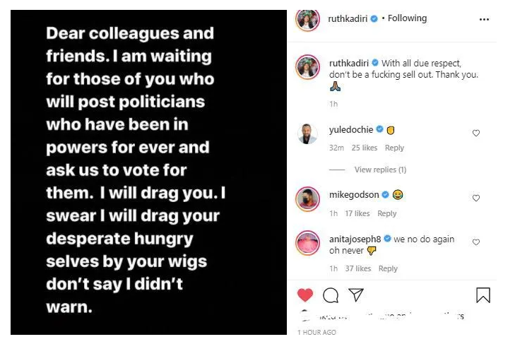 Ruth Kadiri wrote, ”Dear colleagues and friend. I am waiting for those of you who will post politicians who have been in powers forever and ask us to vote for them. I will drag you. I will drag you. I swear I will drag your desperate hungry selves by your wigs don’t say I didn’t warn. With all due respect, don’t be a fucking sell out. Thank you”