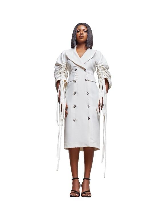 This first outfit is an interesting dress from the 2021 Saliu Collections. It is a double-breasted coat dress with interesting and creative embellishments. It has a lapel collar with sharp, pointy edges that extend beyond the collar area.