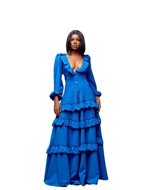 Here is another beautiful outfit from the 2021 Saliu Collection. This ruffled dress begins with a V-neck that is neatly decorated in ruffles, forming a cleavage that extends to the midsection of the chest.