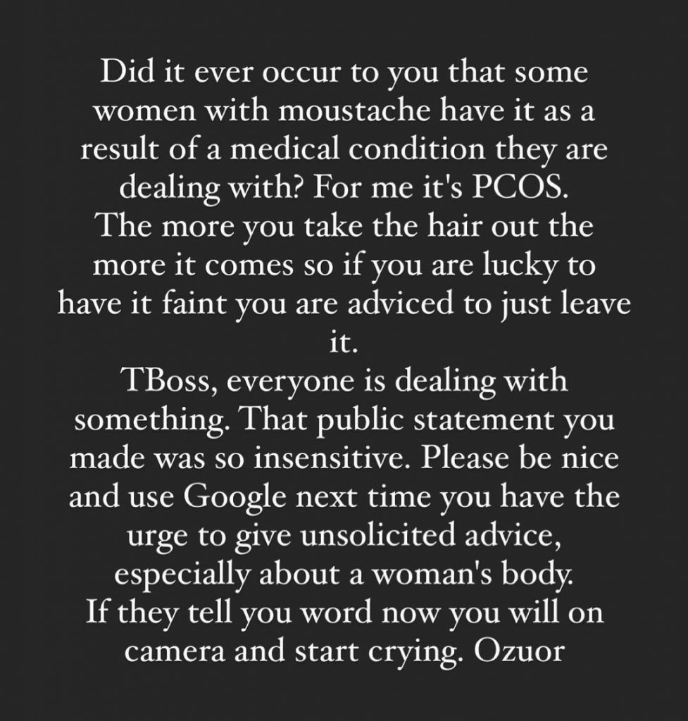 Etinosa wrote: “Did it ever occur to you that some women with moustache have it as a result of a medical condition they are dealing with? For me, it’s PCOS. The more you take the hair out the more it comes so if you are lucky to have it faint you are advised to just leave it. TBoss, everyone is dealing with something. That public statement you made was so insensitive. Please be nice and use google next time you have the urge to give unsolicited advice, especially about a woman’s body. If they tell you a word now you will on camera and start crying. Ozuor”