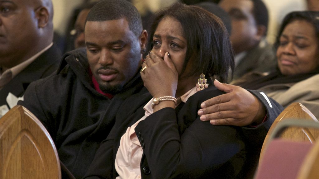 Shirley Chambers cries during Monday’s funeral for her son Ronnie Chambers, 33. She had four children, three boys and a girl, all victims of gun violence in Chicago over a period of 18 years.