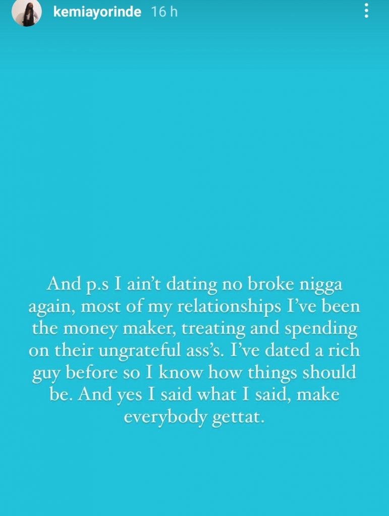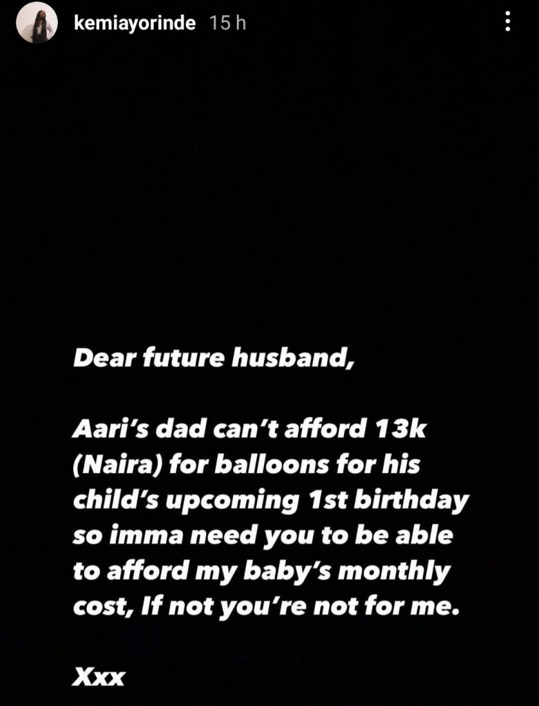 “Dear future husband, Aari’s dad can’t afford 13k (Naira) for balloons for his child’s upcoming 1st birthday so imma need you to be able to afford my monthly cost, if not you are not for me. Xxx,” she wrote.