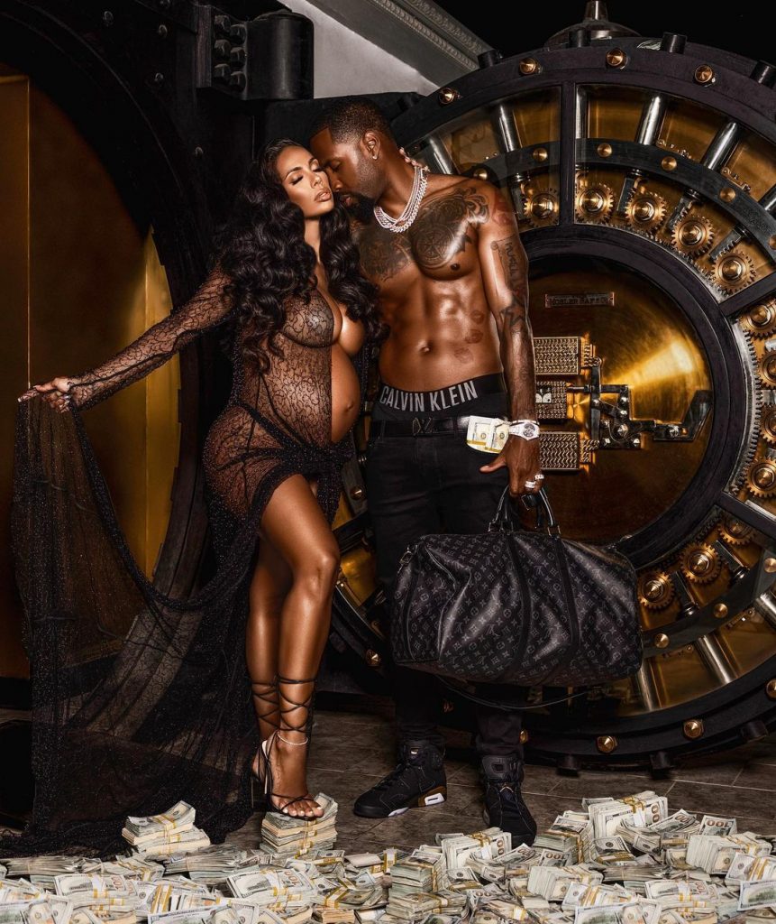 Erica Mena just announced she’s pregnant with her second child in a big way, debuting her growing baby bump in a stunning photoshoot with her husband, Safaree Samuels standing shirtless with stacks of cash under their feet.