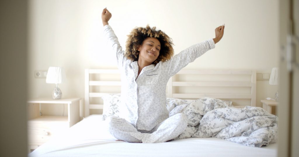 Happy young woman waking up in the morning in bed at home