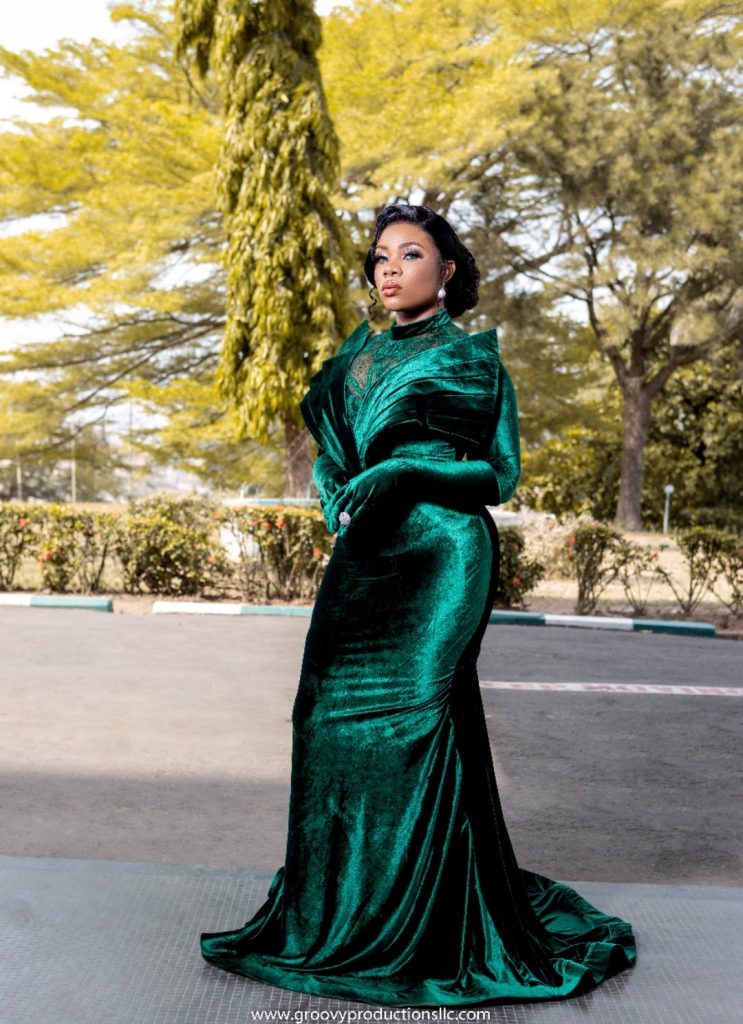 Among her masterpieces is a green velvet dress drawn from her 2021 bespoke designs, which the designer proudly dubs the Enchanté Dress. Crafted from a luxurious velvet fabric, the long-sleeve dress featuring built-in gloves, and subtly enhanced with a mix of light lace fabric, stands tall as a symbol of growth and harvest.