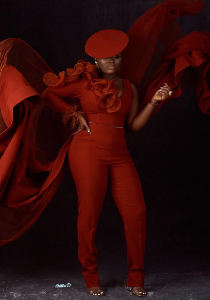 The piece is styled with a matching beret that sets the mood for something fun and playful. This playful undertone notwithstanding, the creation heavily exudes elegance and sophistication, just like every other piece from the stable of Meeyah Creations.