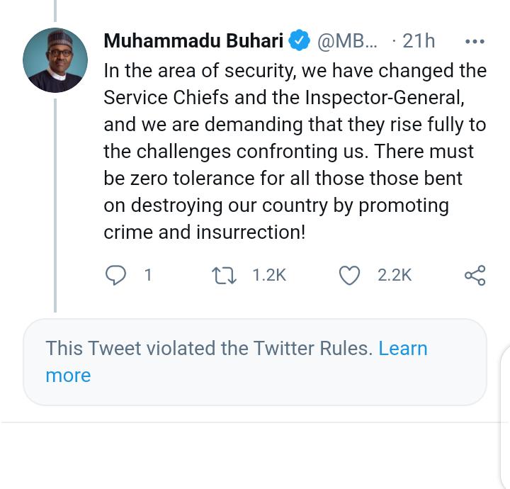 As at the time of filing this report, a check on the president’s official account reveals that the Tweet has been removed.