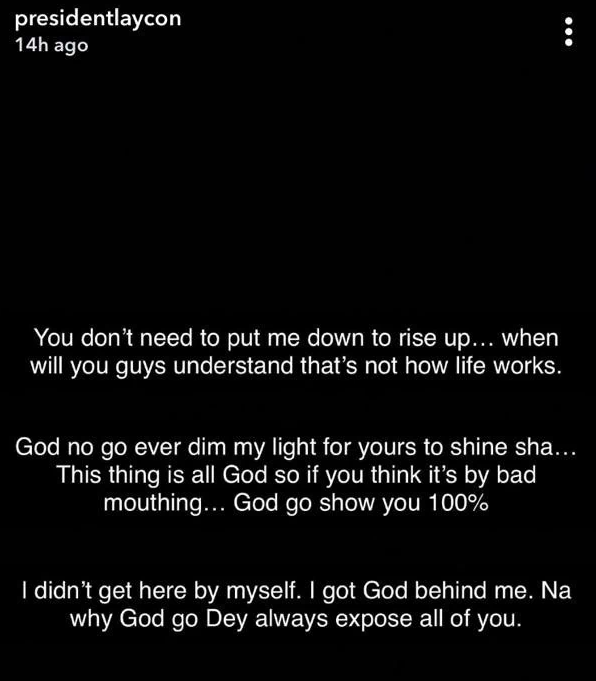 Laycon also cautioned false friends in his post that they don’t have to put him down in order for him to rise, and that’s how life currently works. He also promised to keep winning and breaking records. God is with him, and his Icons are with him, the rapper said in the end. He wrote: