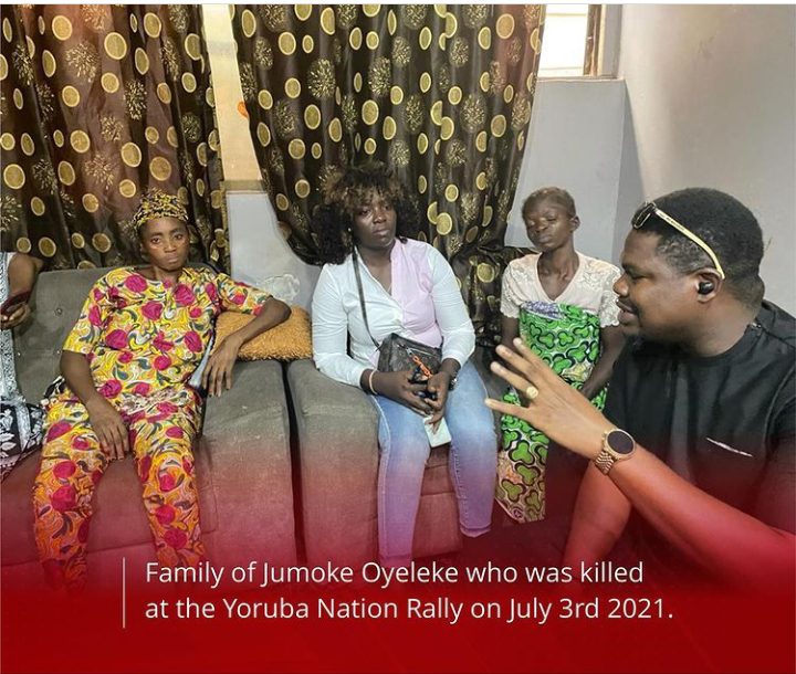 Popular Nigerian Instagram comedian and activist, Debo Macaroni recently visited the family of late Jumoke Oyeleke who was a victim of stray bullet during the Yoruba Nation Rally on July 3.