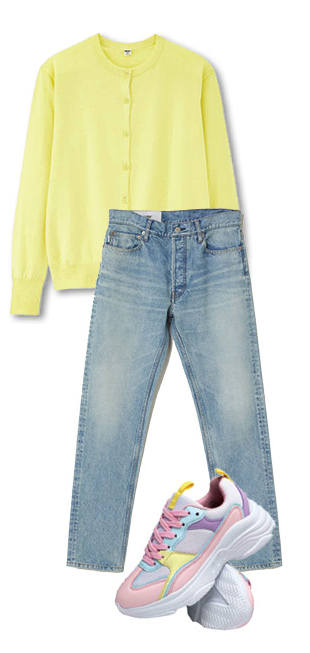 One of the more effortless ways to approach the trend is to simply style with your go-to jeans. If the weather is still cool out, try a pastel sweater and accessorise with a pair of sneakers in another pastel hue.