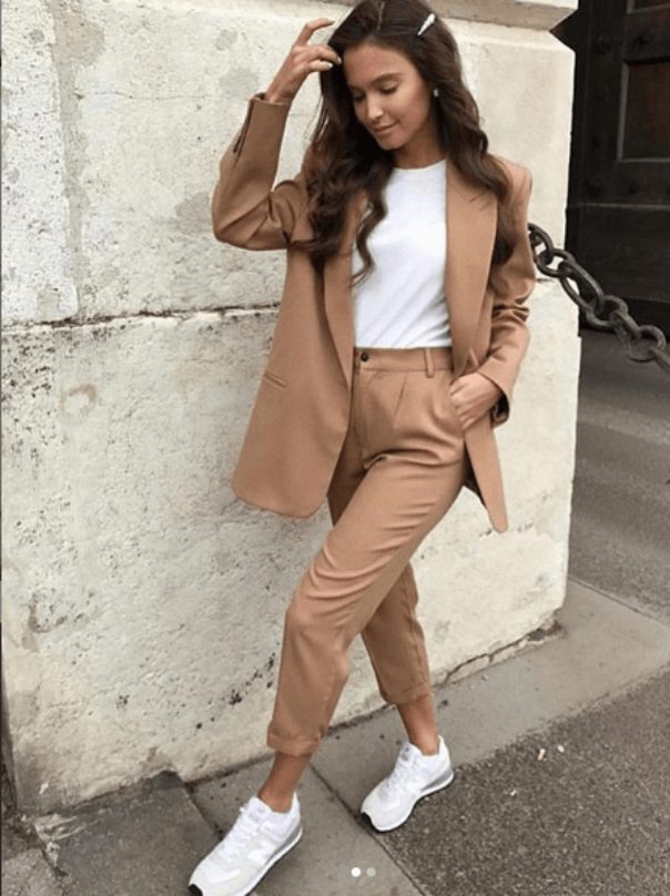 This look is super cool and very modern. An allover check blazer and pants outfit makes a stylish dress to wear at work or even at a party. If you want to look stylish and maintain a professional vibe to your look, this is the outfit for you. Wear a check blazer buttoned up without a tank top and matching check culotte pants. For the shoes, you can wear stylish sneakers and carry a blush pink purse. The retro hairband and cat-eye sunglasses make the look more glamorous.