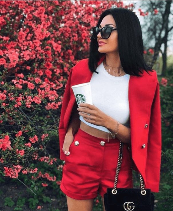 Blazers look great when worn on shorts. Usually, we see ladies wearing blazers on cotton or denim shorts but a shorts suit is a pretty unique way to style an outfit with a blazer. This red blazer short suit look is definitely not for the faint-hearted and only real divas can pull this look off so nicely. The white tank top gives a little breakthrough to the entire red outfit theme. The black evening purse adds to the perfection of the outfit.