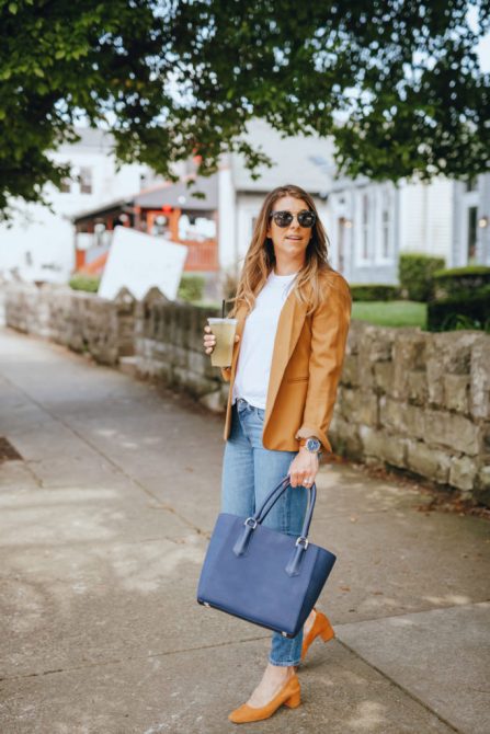 If you want to keep things classic but still elevate your skinny jeans, try adding a simple solid blazer, heels and a structured tote. This look is a go-to for so many—and for good reason. It allows you to easily dress up almost any pair of jeans for a cool, casual and still work-friendly outfit.