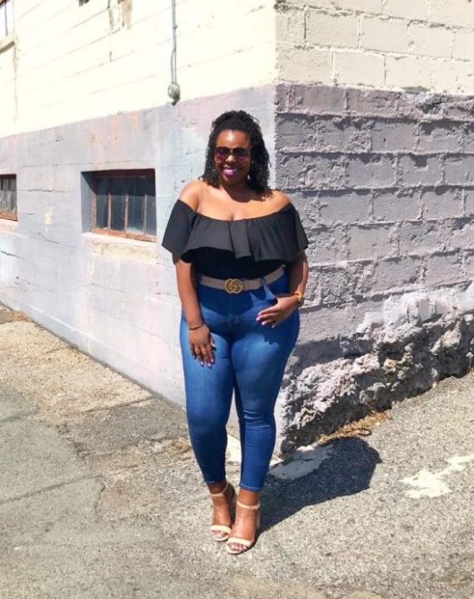 Let the sun shine on those shoulders, baby Try tucking an off-the-shoulder top into your favorite high-rise skinnies. Then, add a belt, heels and pop of color on your lips and you’re ready to go. To make this look more casual, too, you can also swap the heels for sneakers!