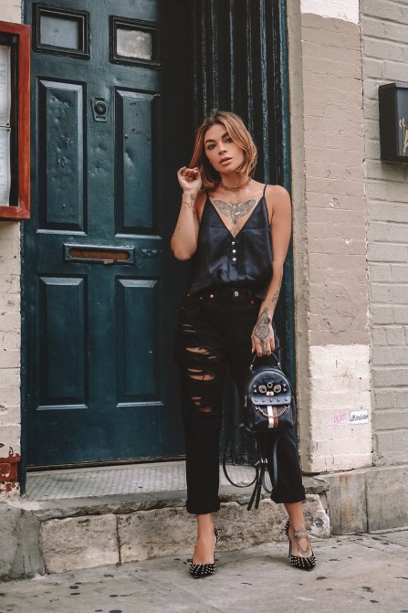 If you’re looking for the perfect edgy-but-still-dressy date night outfit, look no further. Pair your favorite black jeans with a silky cami, statement heels and a matching bag. It’s a simple but effective way to look amazing no matter your plans.