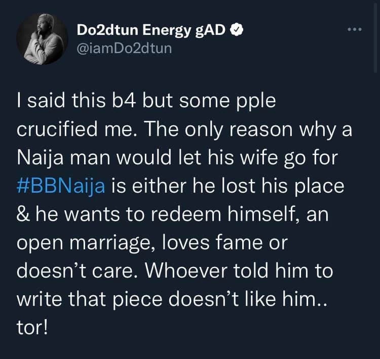 “I said this before but some people crucified me. The only reason why a Naija man would allow his wife go to BBNaija is either he lost his place and wants to redeem himself, an open marriage, loves fame or doesn’t care” he wrote.Dotun says Tega’s husband’s confession was a bad idea.