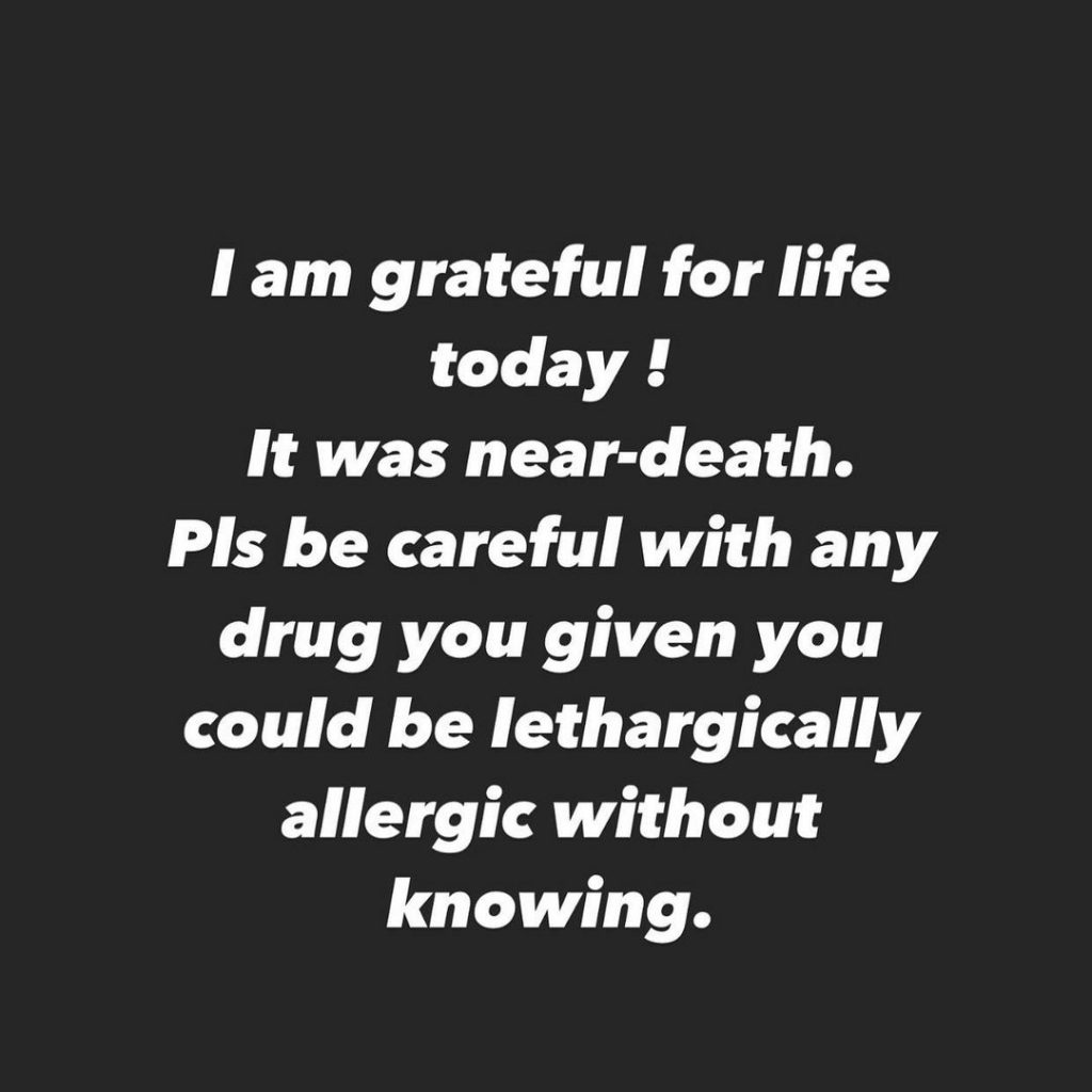 She shared her experience on Instagram and warned all to be careful with any drug one is given as one could be letharlegically allergic without knowing.