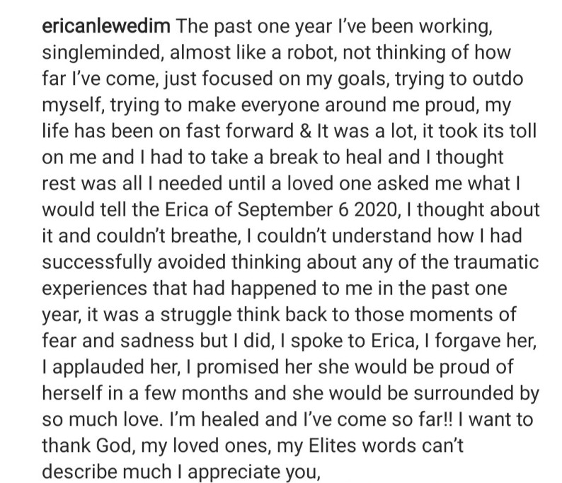 Erica Nlewedim has addressed her disqualification from the Big Brother Naija reality show on the one year anniversary of the fateful day.