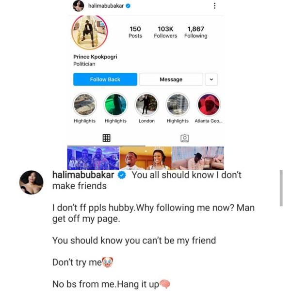 ”Get off my page Clown!”- Halima Abubakar slams Tonto Dikeh’s ex-boyfriend, Prince Kpokpogri, after he followed her on IG