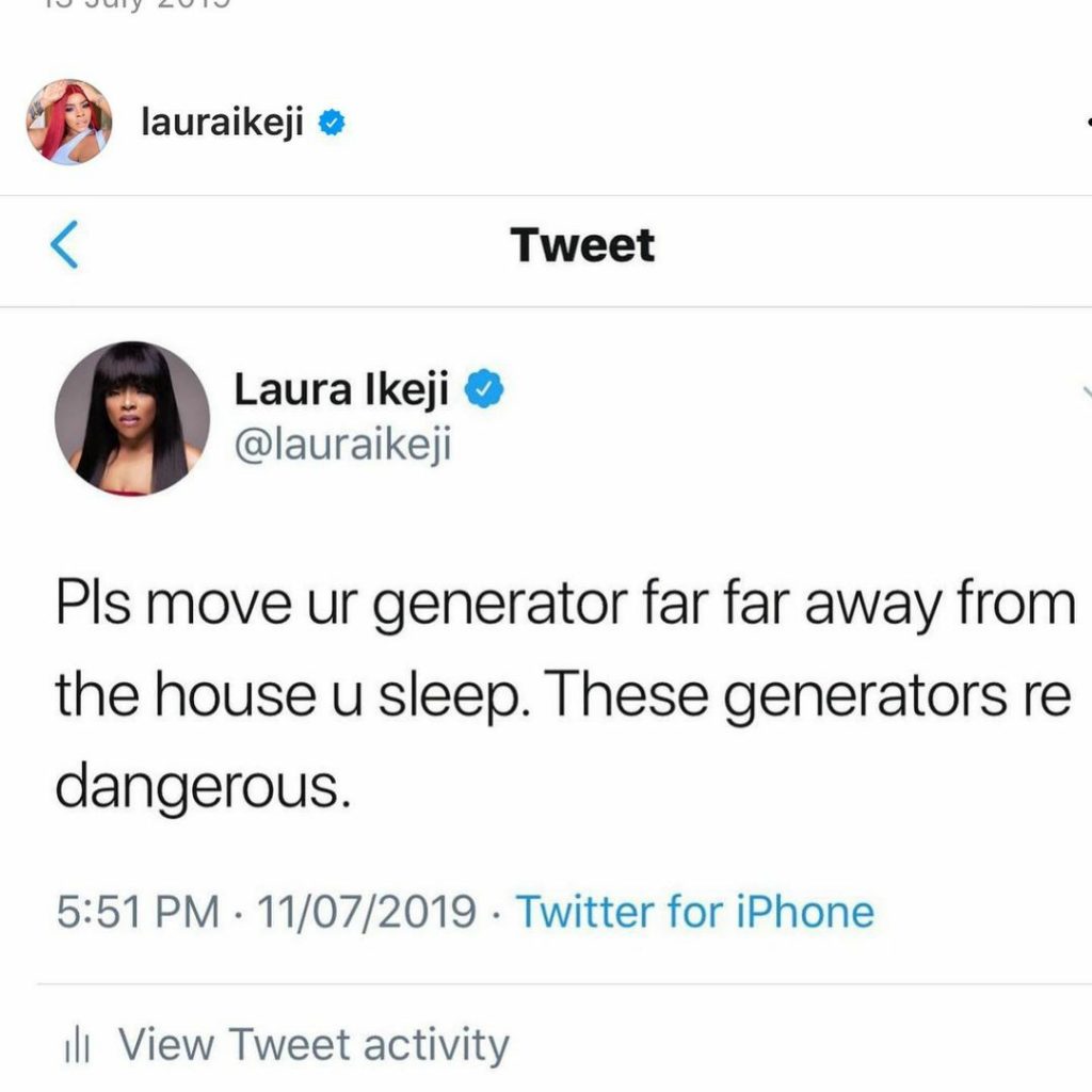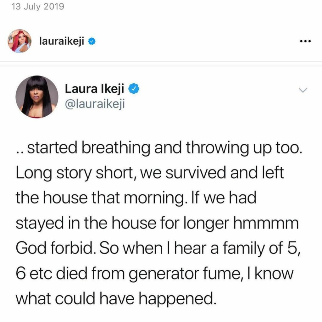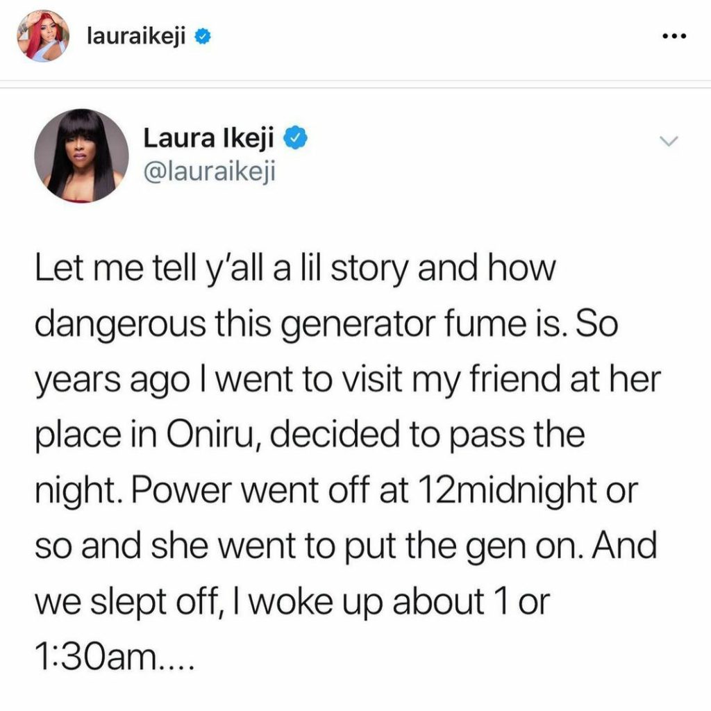 Fashion entrepreneur and social media influencer, Laura Ikeji-Kanu has warned against putting generators close to where one sleeps, because of the fumes it emits.