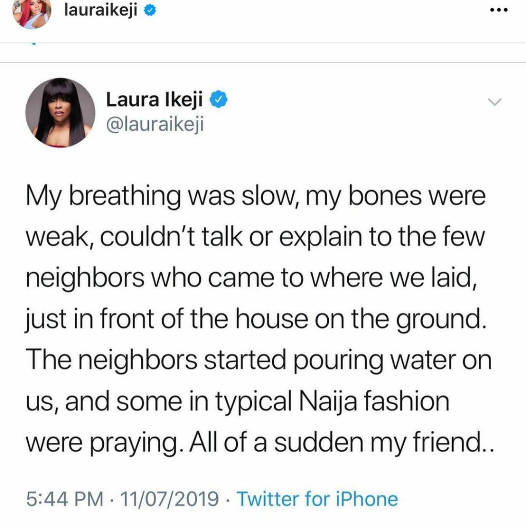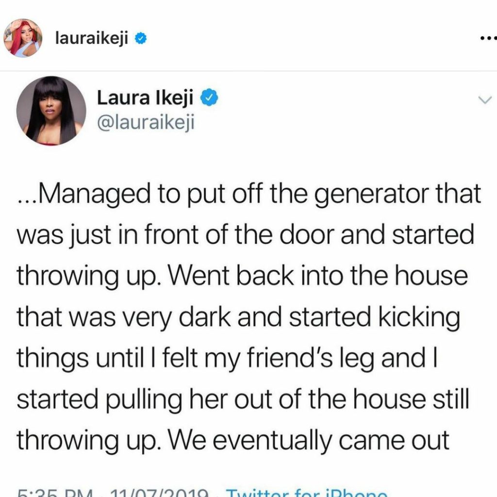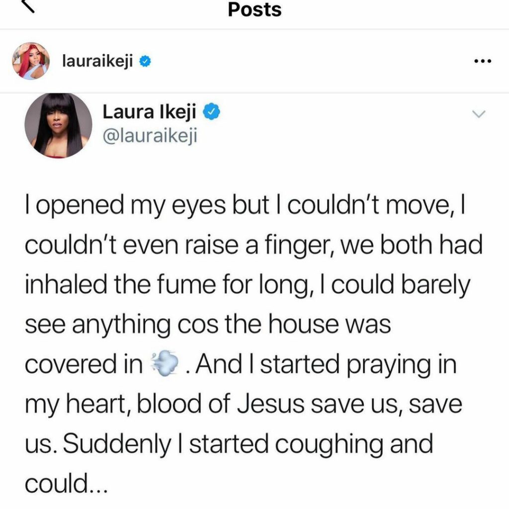 In a post on social media, the 33-year-old recounted how she almost lost her life after inhaling fumes from a generator while visiting a friend few years ago.