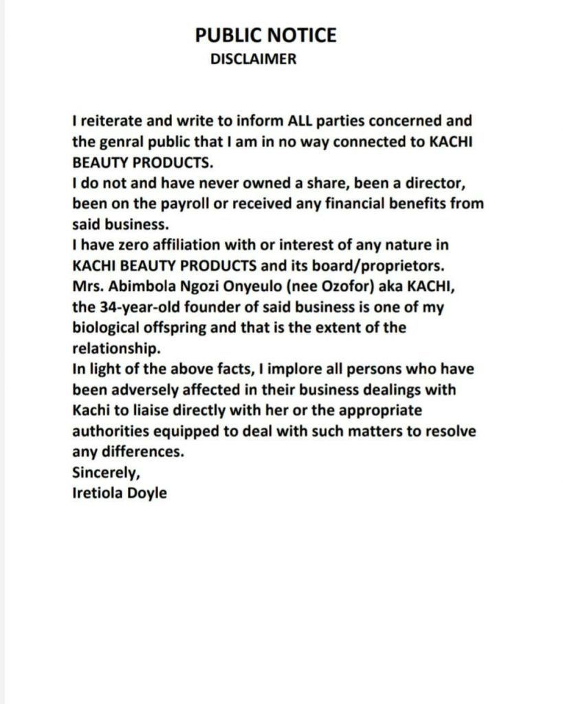 Veteran Nollywood actress, Ireti Doyle has dissociated herself from Kachi Beauty Products, the business of her daughter, Abimbola Ngozikachi Onyeulo.