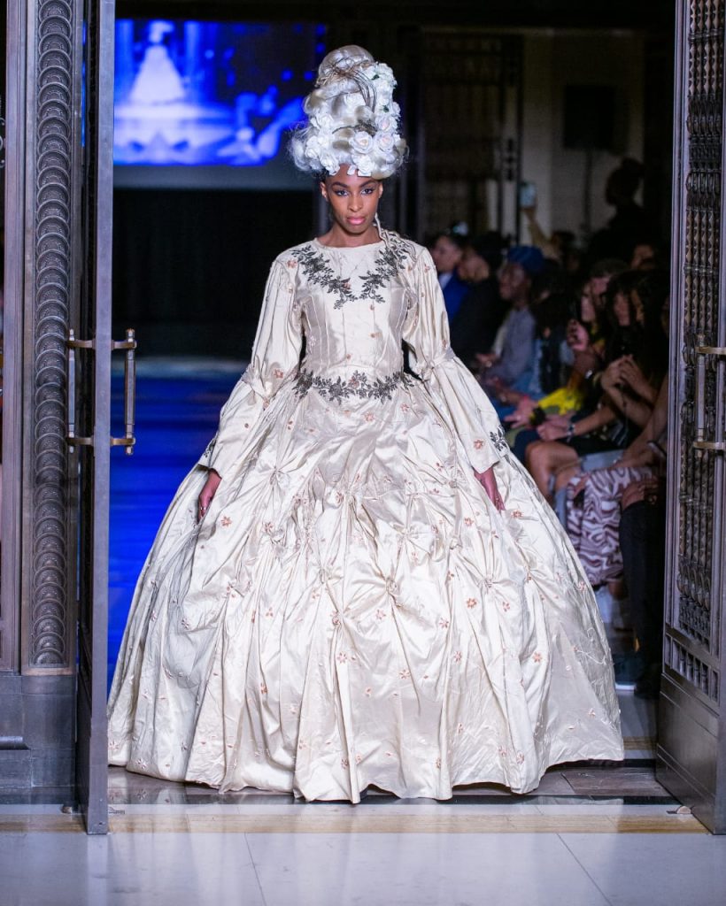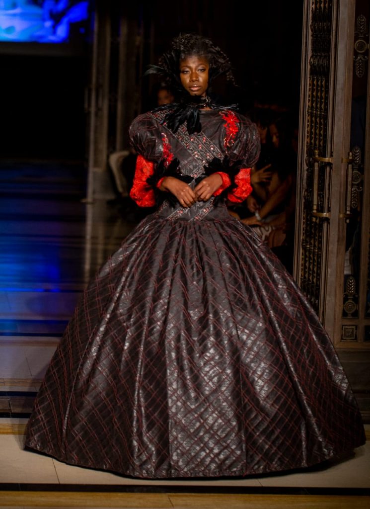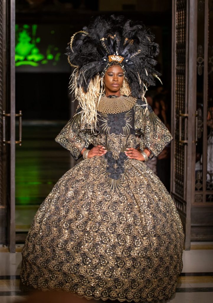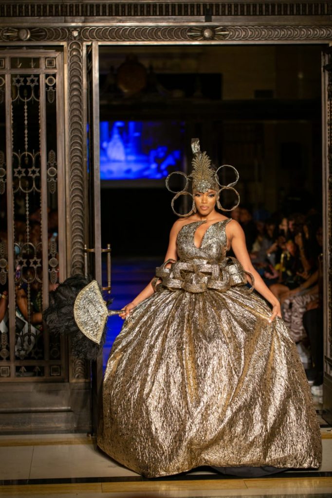 Famous for her outrageously glamorous designs, Mary Martin, again,wowed with outstanding queenly dresses and headgears from the Cleopatra era. The collection which combined African wax plykea and African lace with the 18th century vibe, Mary says is inspired by ‘Black Excellence’ and the slave era. “It also symbolises a reverse history whereby our strength, dignity and gold is reclaimed by us.” she informs.