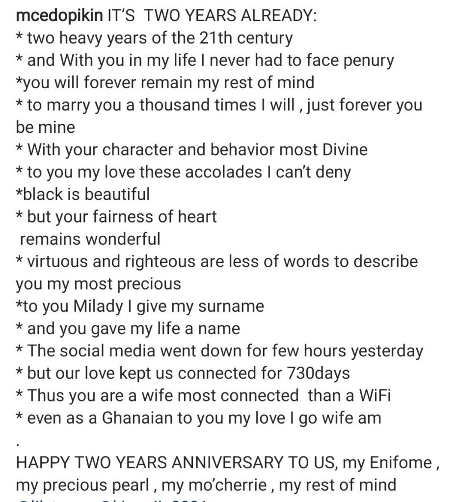 Comedian, MC Edopikin has taken to Instagram to pour praises on his wife as they celebrate their 2nd wedding anniversary.