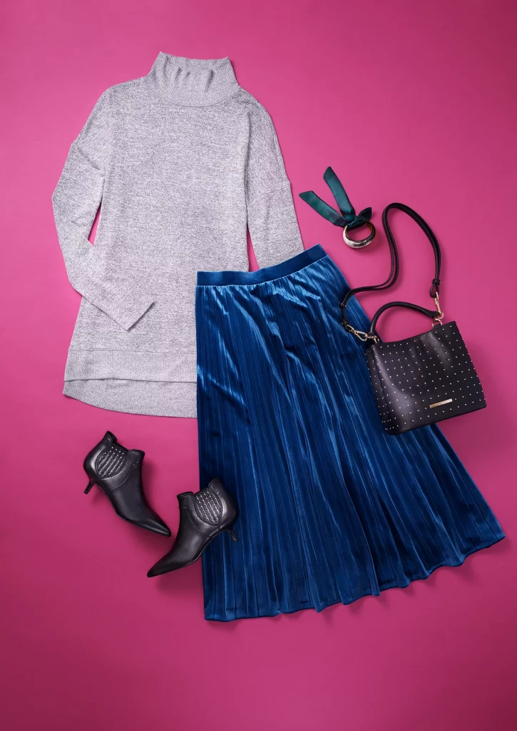 Pair with below knee pleat skirt and turtle neck top.