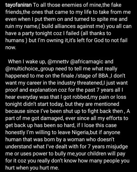 “When I wake up, @mnettv @africamagic and @multichoice_group need to tell me what really happened to me on the finale /stage of BBA. I don’t want my career in the industry threatened, I just want proof and explanation because for the past 7 years, all I hear everyday was that I got robbed. My pain or loss tonight didn’t start today, but they are mentioned because since I’ve been shut up to fight back then.” (sic)