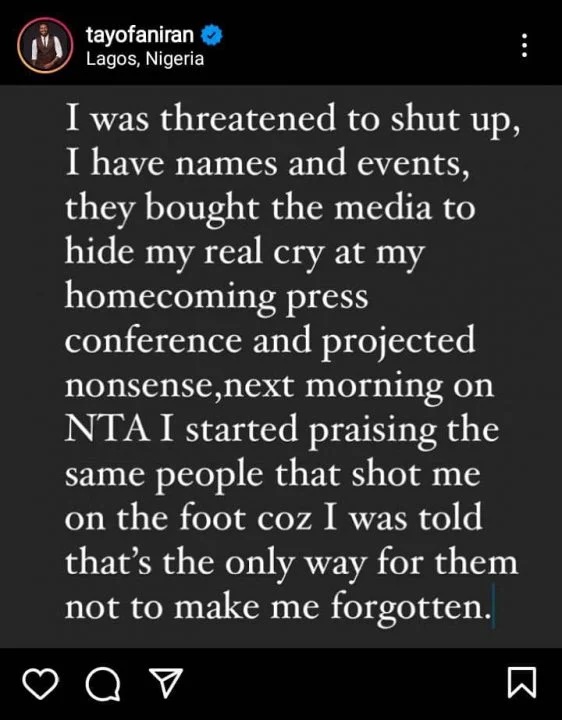 In the recent Instagram post, he said, “I was threatened to shut up, I have names and events, they bought the media to hide my real cry at my homecoming press conference and projected nonsense. The next morning on NTA, I started praising the same people that shot me in the foot because I was told that’s the only way for them not to make me forgotten.” (sic)